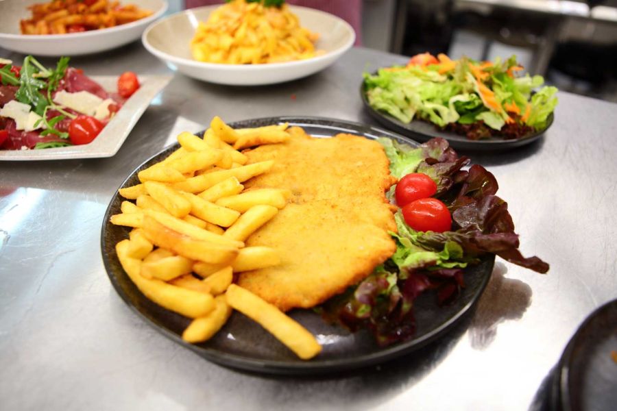 paniertes Schweineschnitzel mit Fleischsoße, dazu Pommes Frites und kleiner, gemischter Salat
